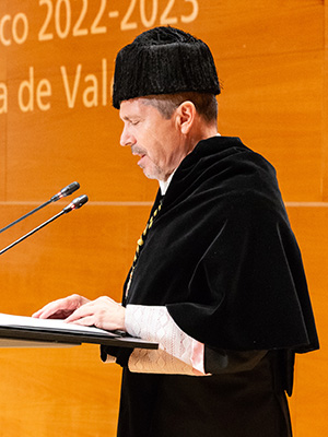 Y una especial felicitación a quienes habéis recibido los Premios Extraordinarios de Tesis Doctorales en la convocatoria 2023. Son sin duda el reconocimiento a la excelencia de un trabajo que ha destacado entre otras tesis doctorales sin duda también excelentes. Enhorabuena. Y enhorabuena al doctor Juan Enrique Vázquez Lozano por sus palabras en representación de los premiados.